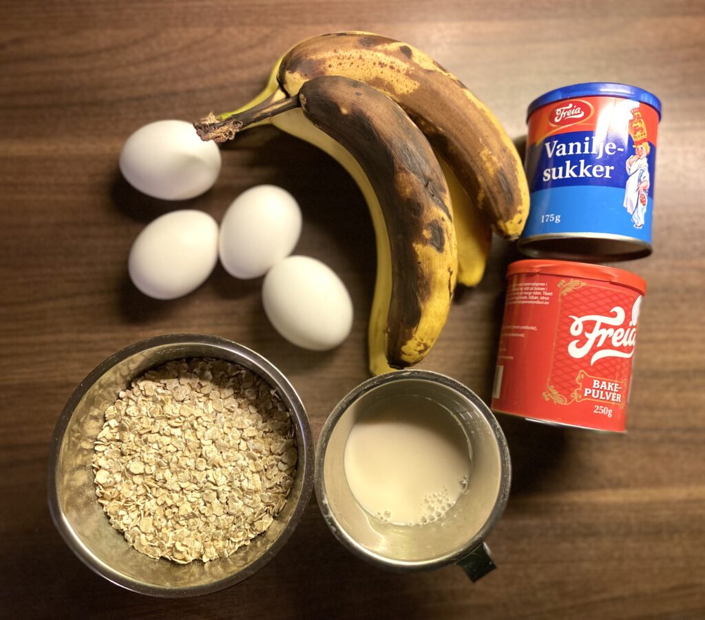 Finn frem ingrediensene. Bananer, egg, havregryn, melk (både kumelk og andre alternativer fungerer), bakepulver og gjerne litt vaniljesukker.