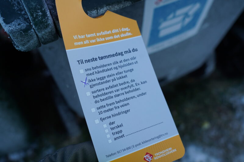 Vi forstår at det kan ta litt tid å endre avfallsløsningen hjemme. Kanskje skal du bygge om noe, kanskje må du snakke litt ekstra med naboen og kanskje må du få noen nye rutiner. Ta det helt med ro: Vi tømmer avfallet ditt, selv om ikke alt er helt perfekt fra første stund. Dersom avfallsbeholderen ikke er tilgjengelig, slik forskriften sier, på tømmedag, vil vi henge igjen en lapp på beholderen din som forteller hva du må gjøre til neste gang vi kommer.