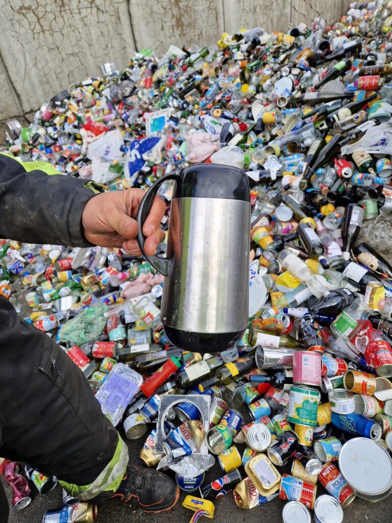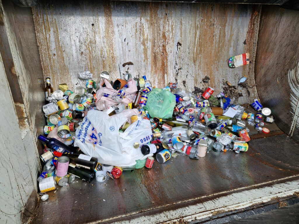 Avfallsposene åpnes og innholdet tas ut og sorteres.