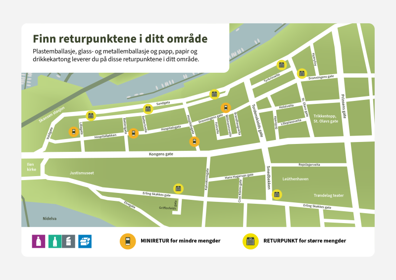 - i området Hospitalsløkkan/Dronningens gate plasseres det ut fire nye minireturpunkter for plastemballasje, papp og papir og glass- og metallemballasje (les mer om disse lenger ned i saken).