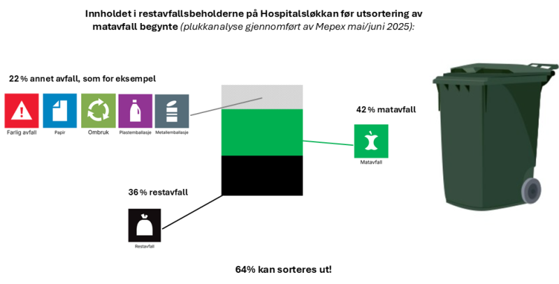 Når matavfallet går i egen beholder, blir det også mindre restavfall igjen. Fra plukkanalyser i Hospitalsløkkan fra mai i år vet vi at restavfallet inneholdt 42 prosent matavfall, målt i vekt.